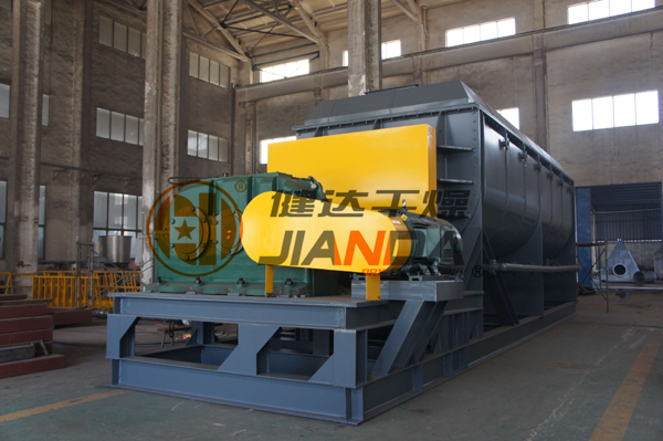 此设备单台外形长宽高分别为14.2m,3.7m,3.6m。3台设备每天共可烘干成品800t。在材质上,设备上箱体,下箱体,端盖板都使用了碳钢制作,其中,由于桨叶结构特殊,采用了特殊钢制作,并做酸化处理。